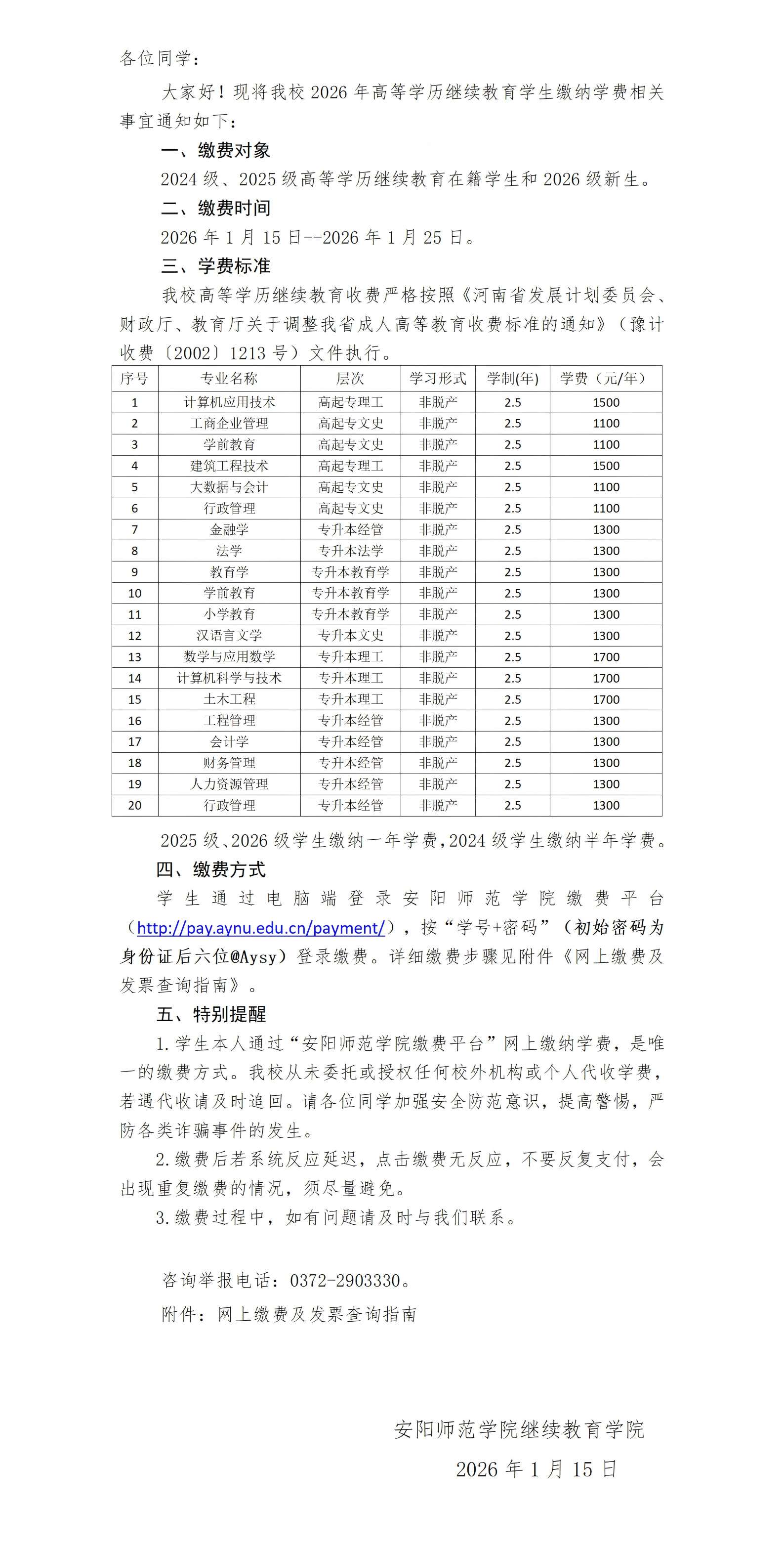 安阳师范学院关于2026年高等学历继续教育学生缴纳学费的通知